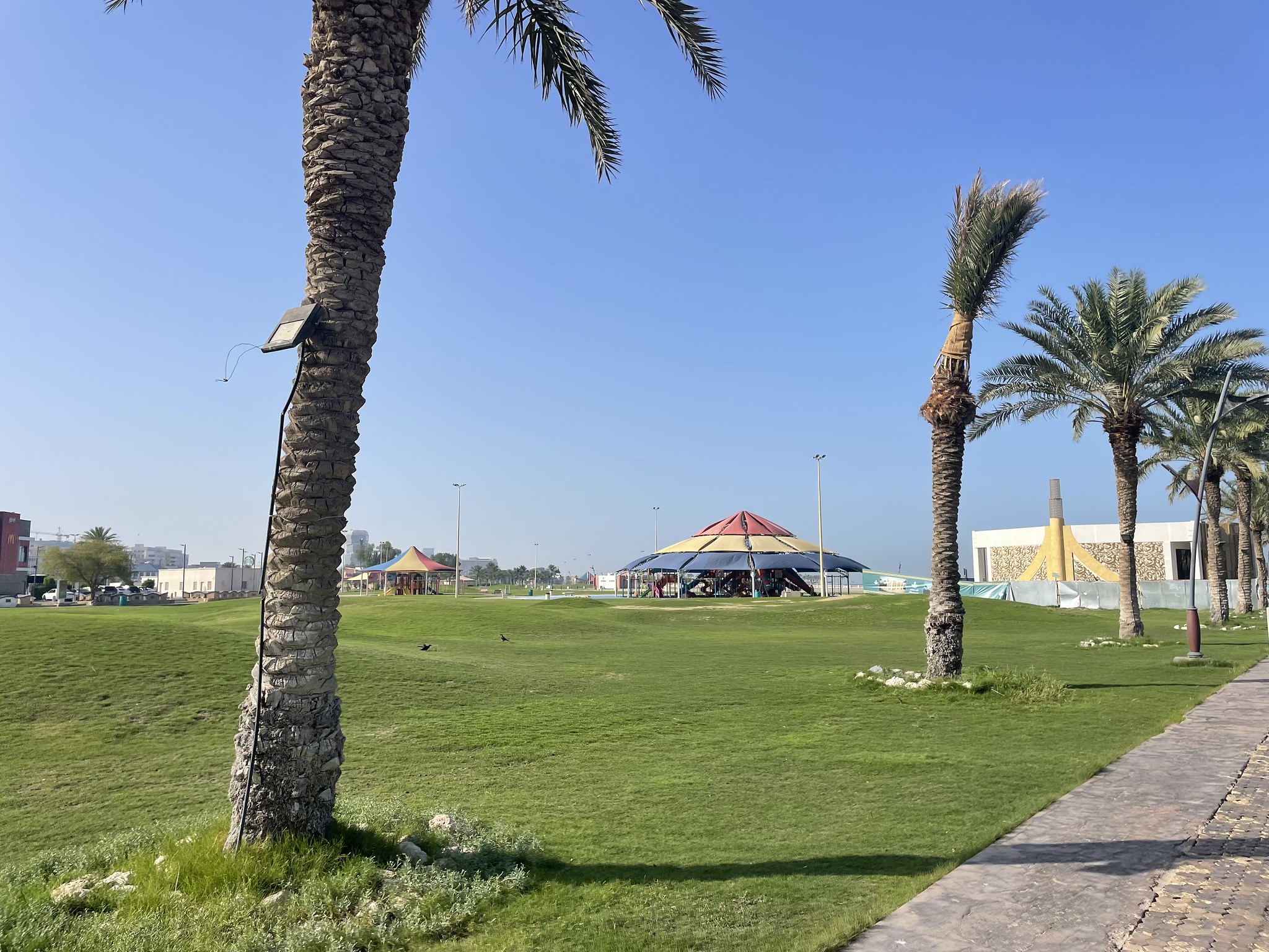Ez a kép már Al Khobar majdnem tengerpartján készült. Felhívom a figyelmet arra, hogy ez itt nem műfű, hanem igazi. De hogy a pálmafán mit keres a napelem, azt nem tudom. Azt csak itthon vettem észre.